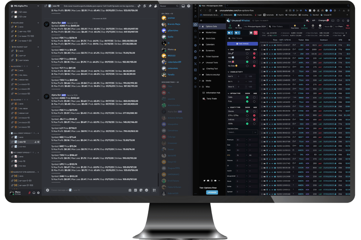 Accede a más de 40 canales con scanners configurados para encontrar oportunidades en estrategias direccionales, venta de puts, covered calls y más. Encuentra la operativa ideal para ti.